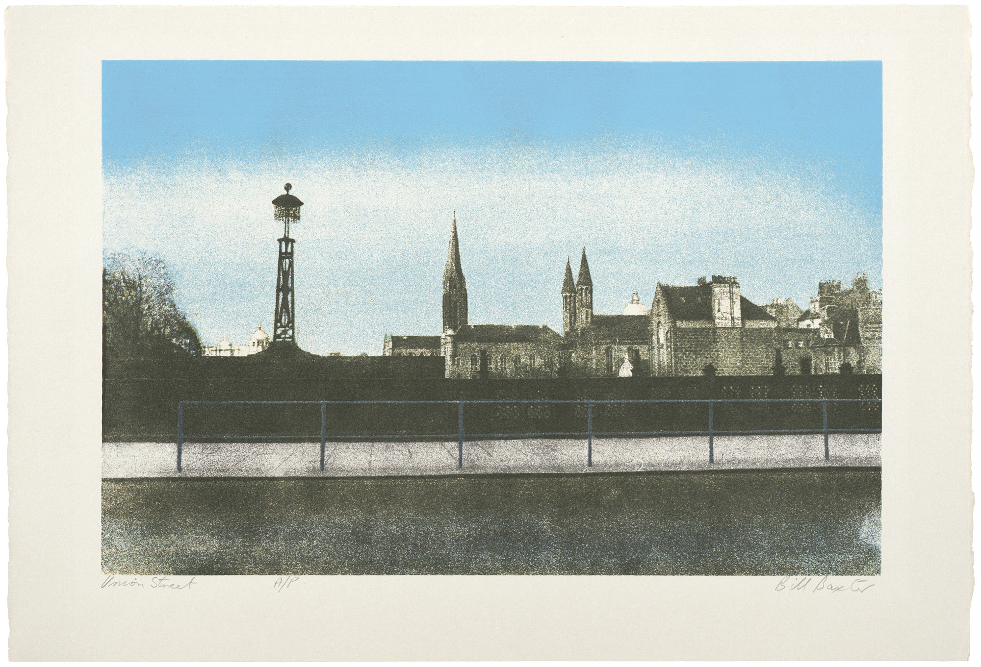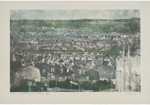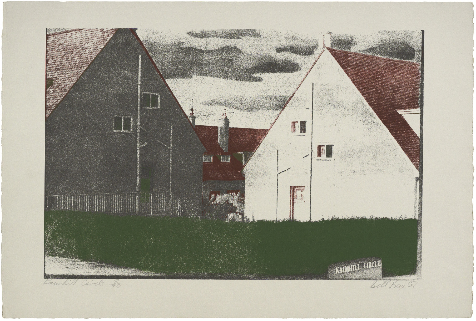 These prints were derived from photographs taken by the artist. A negative was placed in the enlarger and projected through a ground glass on to a sheet of high contrast film. The ground glass broke up the areas of tone into the irregular dot pattern seen in the prints. The artist then altered the sheets of film by scraping out highlights and adding more tone by spraying on ink with a fine airbrush. Screens were then made from these sheets of film - only one screen per print, the various colours and tones being obtained by spraying and painting out parts of the stencil.