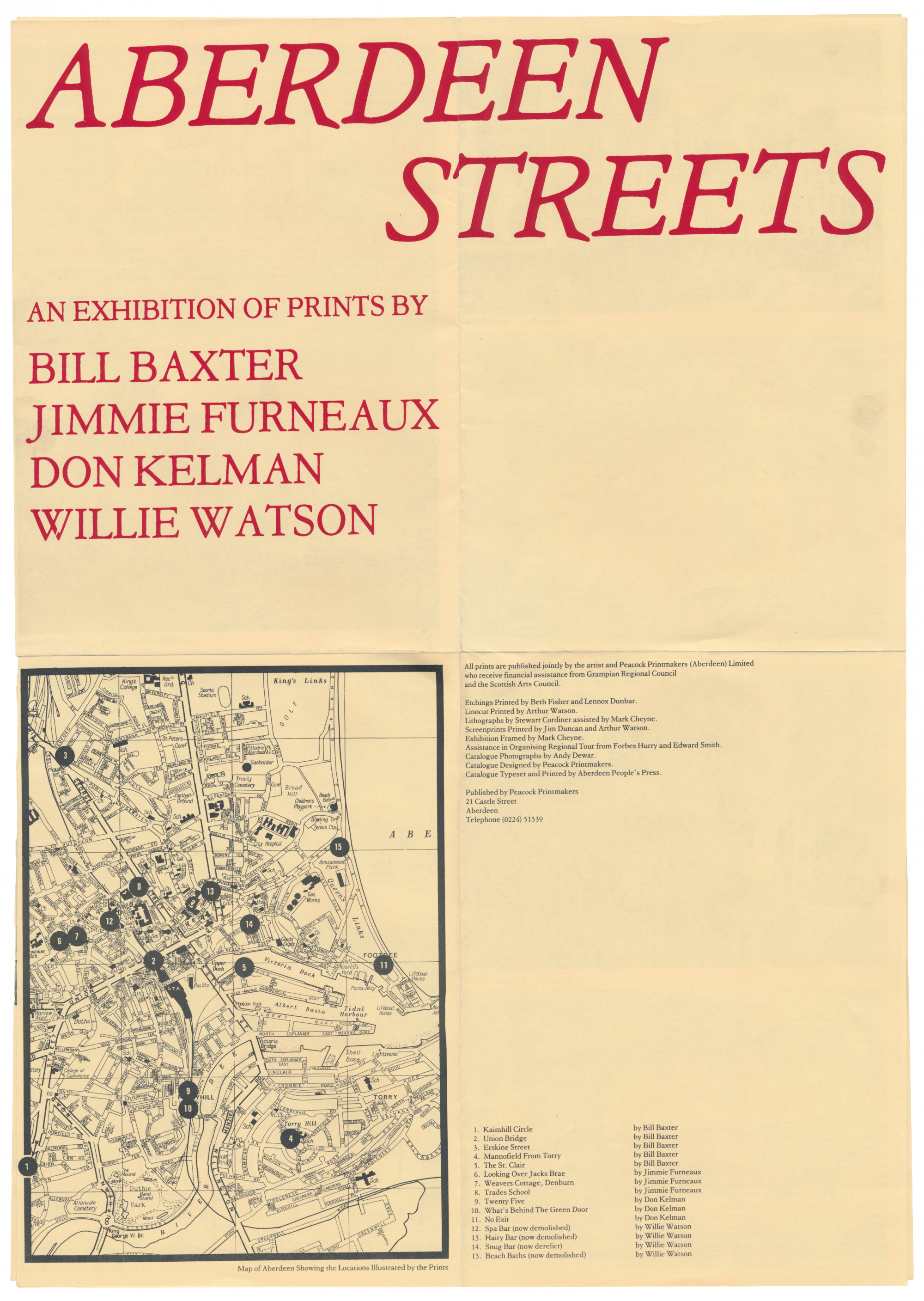 First shown in Artspace Galleries, Belmont Street before a tour of non-art Art venues in the North East of Scotland. The exhibition featured a suite of 15 prints from Bill Baxter, Jimmie Furneaux, Don Kelman and Willie Watson. The catalogue shown here was in the form of a double sided two fold brochure, printed by Aberdeen Peoples Press.