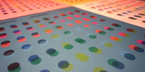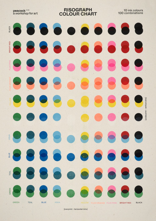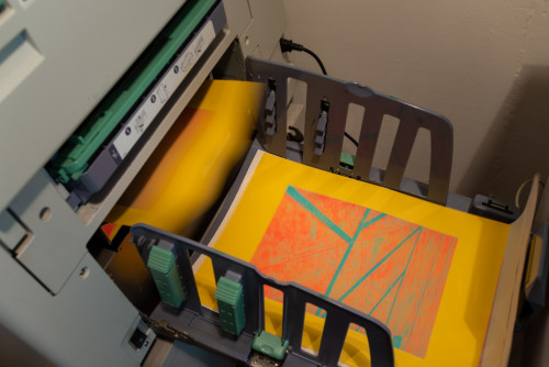 Our machine can print two colours at once onto paper up to a maximum size of A3 and has interchangeable drums for each colour. There are around 20 official Risograph colours with an array of custom ones available too. We currently have 9 ink colours: Aqua, Black, Blue, Bright Red, Fluorescent Orange, Fluorescent Pink, Green, Teal and Yellow. We have 11 different recycled paper stocks available in various weights and colours. The maximum weight the Risograph can process is 250gsm. Due to the nature of soy-based inks, only uncoated papers can be used for Riso printing; these take a while to dry.