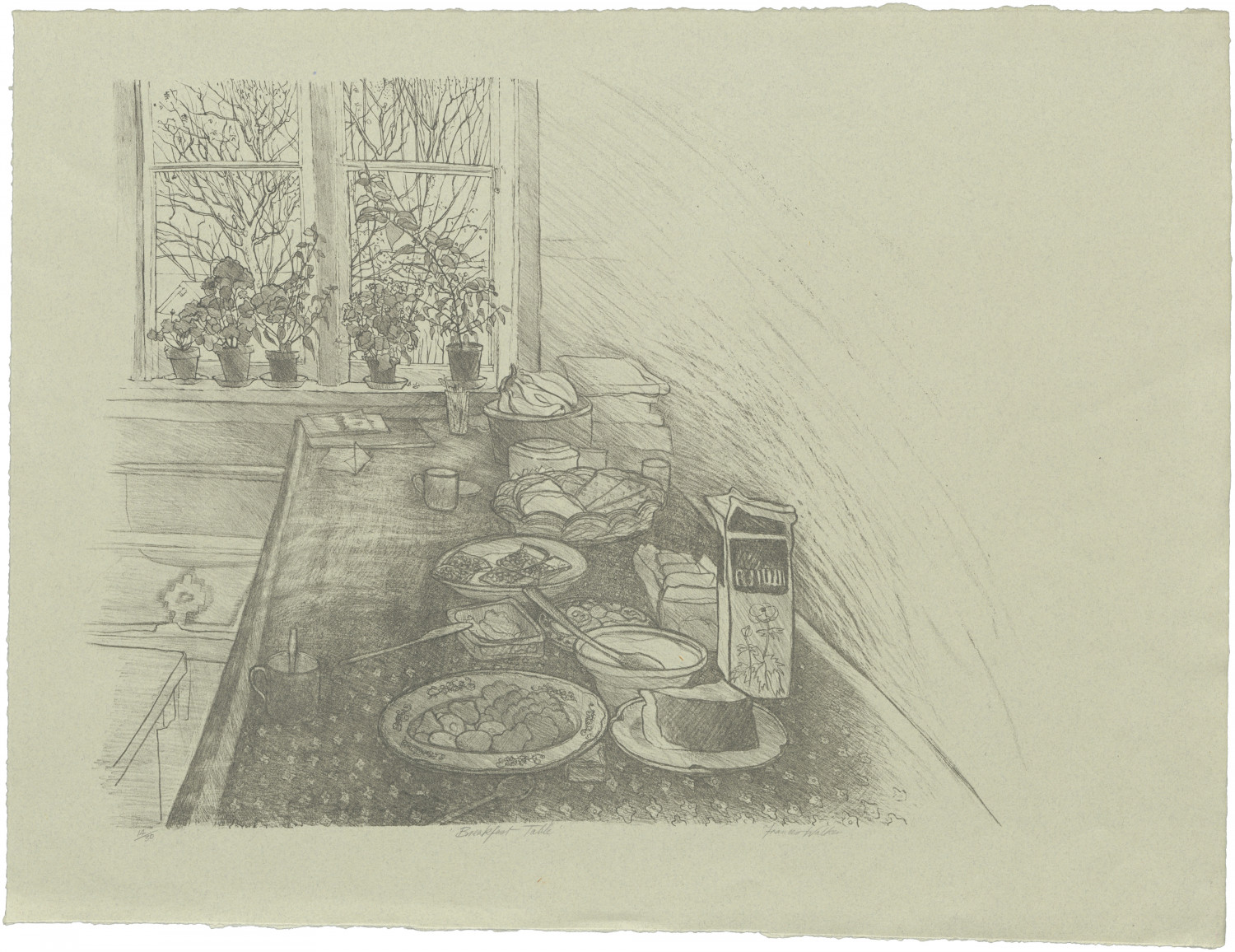 “Perhaps the artist who has been most involved with Peacock Printmakers from the earliest Board of Management through chairing the organisation during a particularly difficult period, is Frances Walker. She has been a regular user making countless etchings, monoprints and collographs. Her many collaborations with staff printers have extended the technical repertoire in each department through testing combinations of line and texture. All her many exhibitions in the last fifteen years have featured a substantial print element and she has always demonstrated a very personal involvement in all stages of production. It was most fitting that Frances was chosen to feature in the first exhibition project that Peacock was to produce with an individual artist. The Finnish Suite was the result of an extended visit to Finland on a Gillies bursary from the Royal Scottish Academy. Two etchings, a screenprint and six lithographs resulted as well as additional unique proofs. The lithographs were particularly succesful, relying on Frances’s mastery of drawing. Although some have touches of screenprinted colour and one is printed from two blacks from different stones the overall impression is of fully toned drawings on a wonderfully sympathetic range of softly coloured hand-made papers from Barcham Green. In these prints Frances fully exploits the unique possibilities offered by a range of drawing techniques on lithographic limestone. Crayons are used along with pen and ink and particularly the restrained use of blades to scrape back the drawing allowing negative lines to enliven tonal passages. This project marked the start of a most fruitful collaboration between Frances and lithographer Stewart Cordiner.”