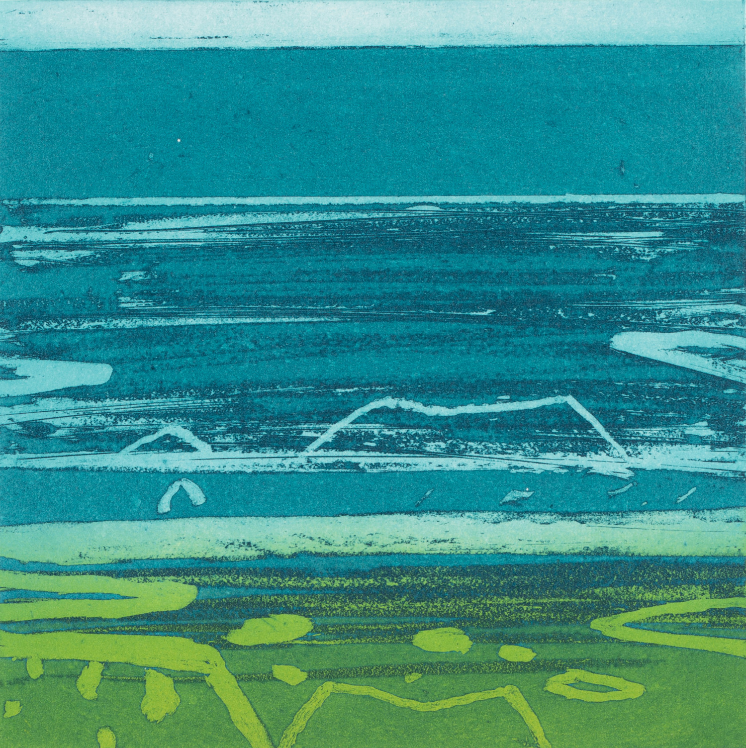 Through the varied use of bold composition, strong contrast and richly textured painted and collaged surfaces Barbara Rae evokes a memorable atmosphere in all her work. At first glance, Rae's paintings seem like planes of abstracted colour, but once your eyes adjust you can make out rural landscapes and industrial architecture. Harbours and coastlines are prominent in her paintings, where rocks become ships, and trees become electricity pylons.