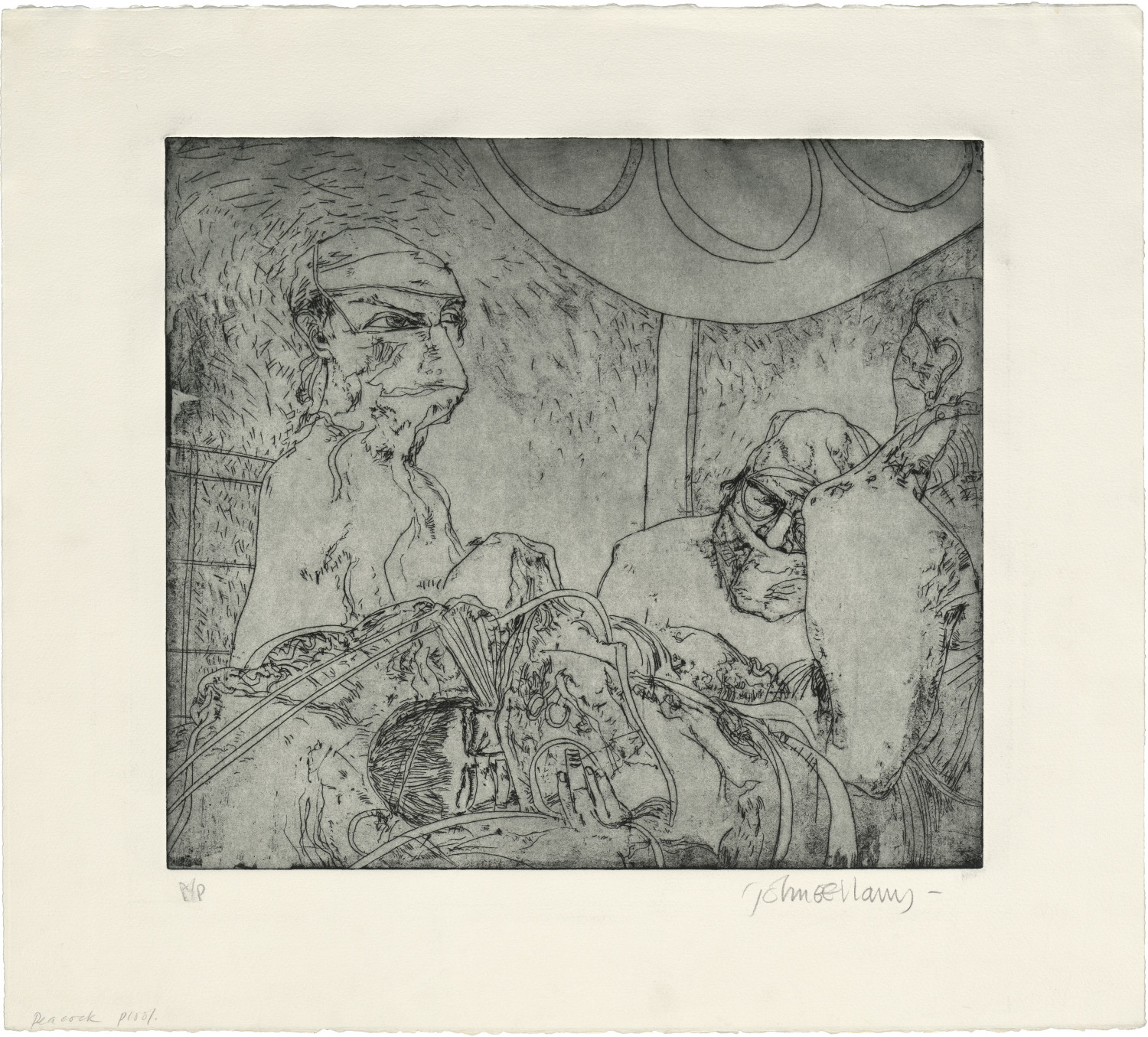 John Bellany (1942 - 2013) studied at Edinburgh College of Art from 1960-65 and at Royal College of Art, London from 1965-68. He grew up in the small fishing village of Port Seaton where his father was a fisherman and many of the images he uses symbolically come form the sea: boats, birds, fish and other sea creatures. Animals also appear in this symbolic language, sometimes with traditional meaning (artist as monkey) and sometimes personal (self portrait as dog). Fate is represented as a clock or playing cards. Throughout his career Bellany has portrayed, directly obliquely, events on his own life. Portraits, especially self-portraits are central to his work.