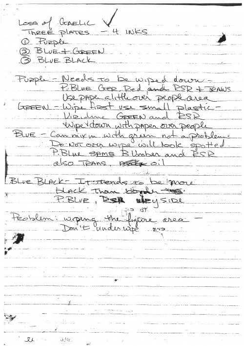 Taken from the 1991 Peacock publication 'The Artist As Voyager' - New work by Richard Demarco & Will Maclean publication produced by Peacock, Alan Woods describes the print: 'Loss of Gaelic' is a poem by Meg Bateman, who also produced the Gaelic version of 'Trio'. As is clear in the black & white proof of the central plate, much of the original drawing has been obscured in the final version, but the figures recall earlier works, such as the etching 'Memorial for the Glendale Martyrs'.