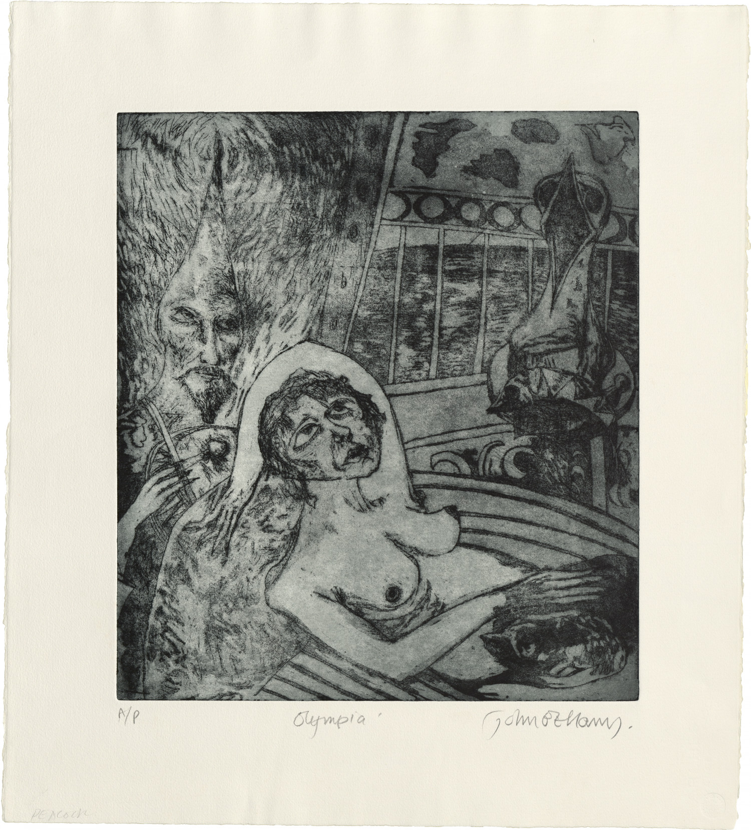 John Bellany (1942 - 2013) studied at Edinburgh College of Art from 1960-65 and at Royal College of Art, London from 1965-68. He grew up in the small fishing village of Port Seaton where his father was a fisherman and many of the images he uses symbolically come form the sea: boats, birds, fish and other sea creatures. Animals also appear in this symbolic language, sometimes with traditional meaning (artist as monkey) and sometimes personal (self portrait as dog). Fate is represented as a clock or playing cards. Throughout his career Bellany has portrayed, directly obliquely, events on his own life. Portraits, especially self-portraits are central to his work.