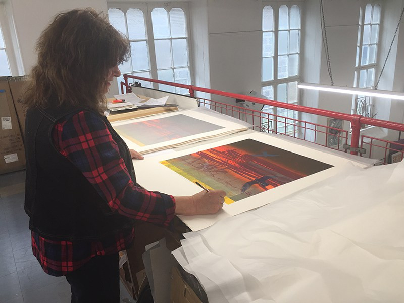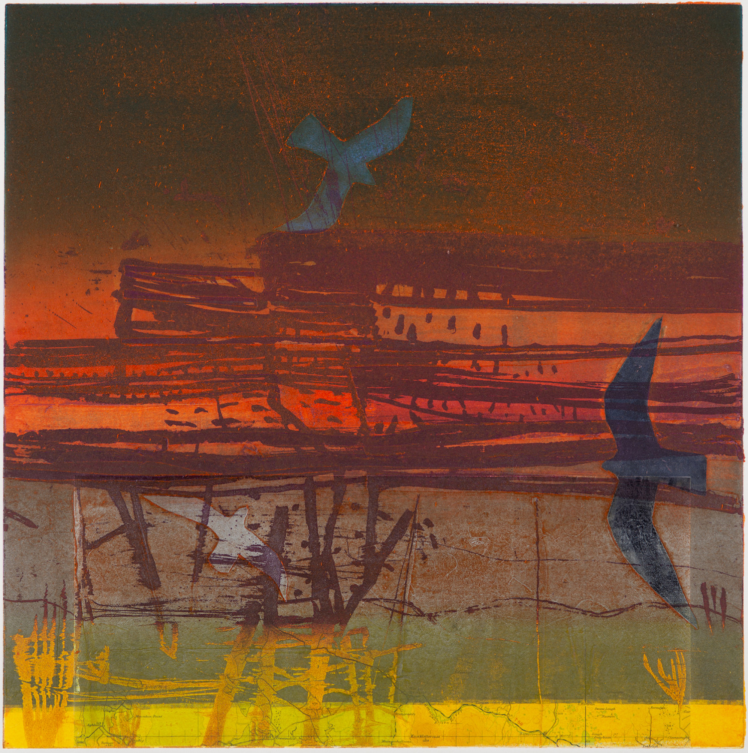 Through the varied use of bold composition, strong contrast and richly textured painted and collaged surfaces Barbara Rae evokes a memorable atmosphere in all her work. At first glance, Rae's paintings seem like planes of abstracted colour, but once your eyes adjust you can make out rural landscapes and industrial architecture. Harbours and coastlines are prominent in her paintings, where rocks become ships, and trees become electricity pylons.