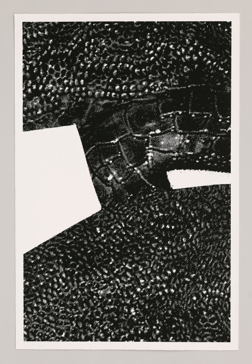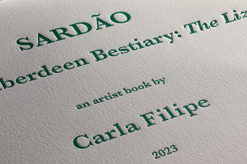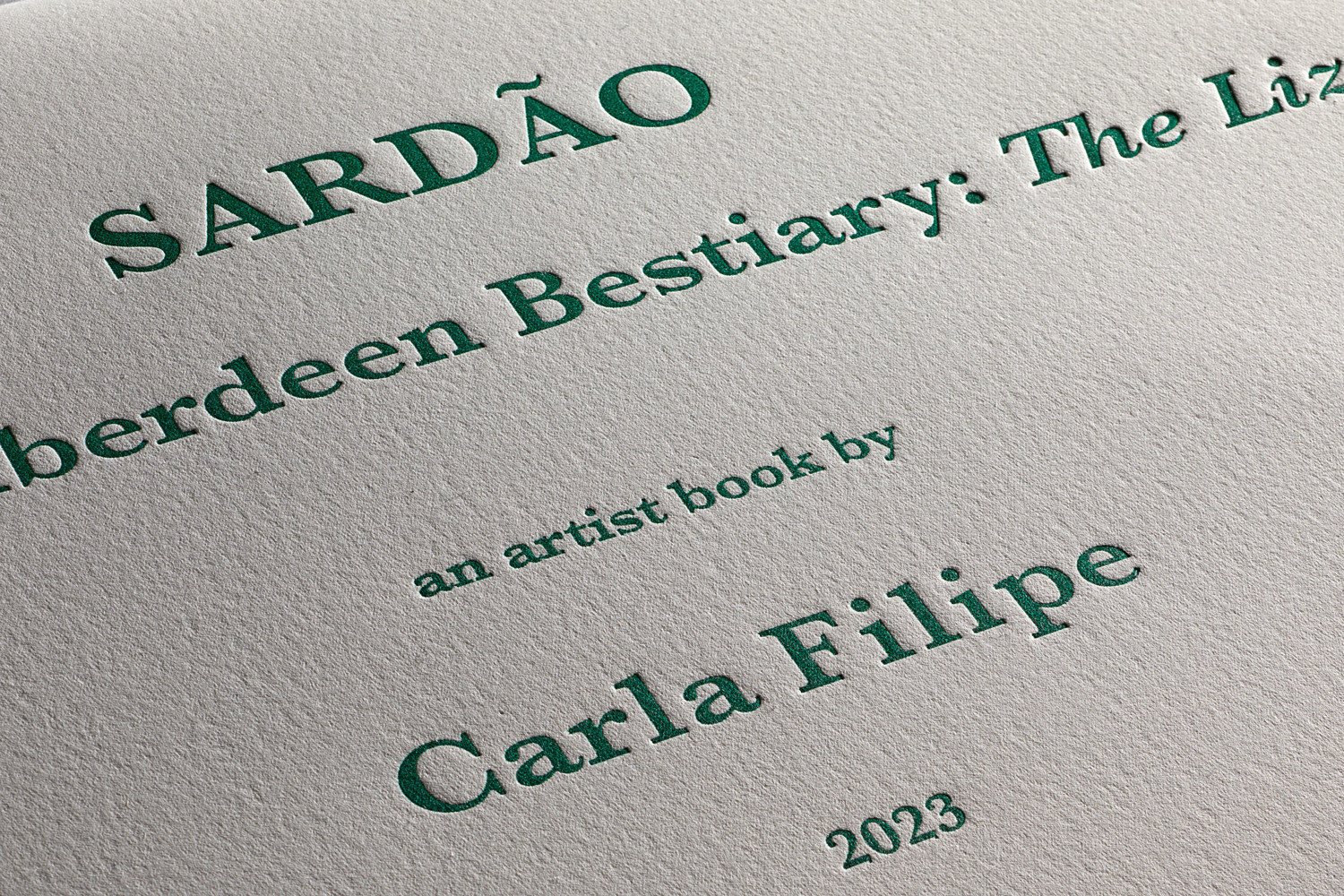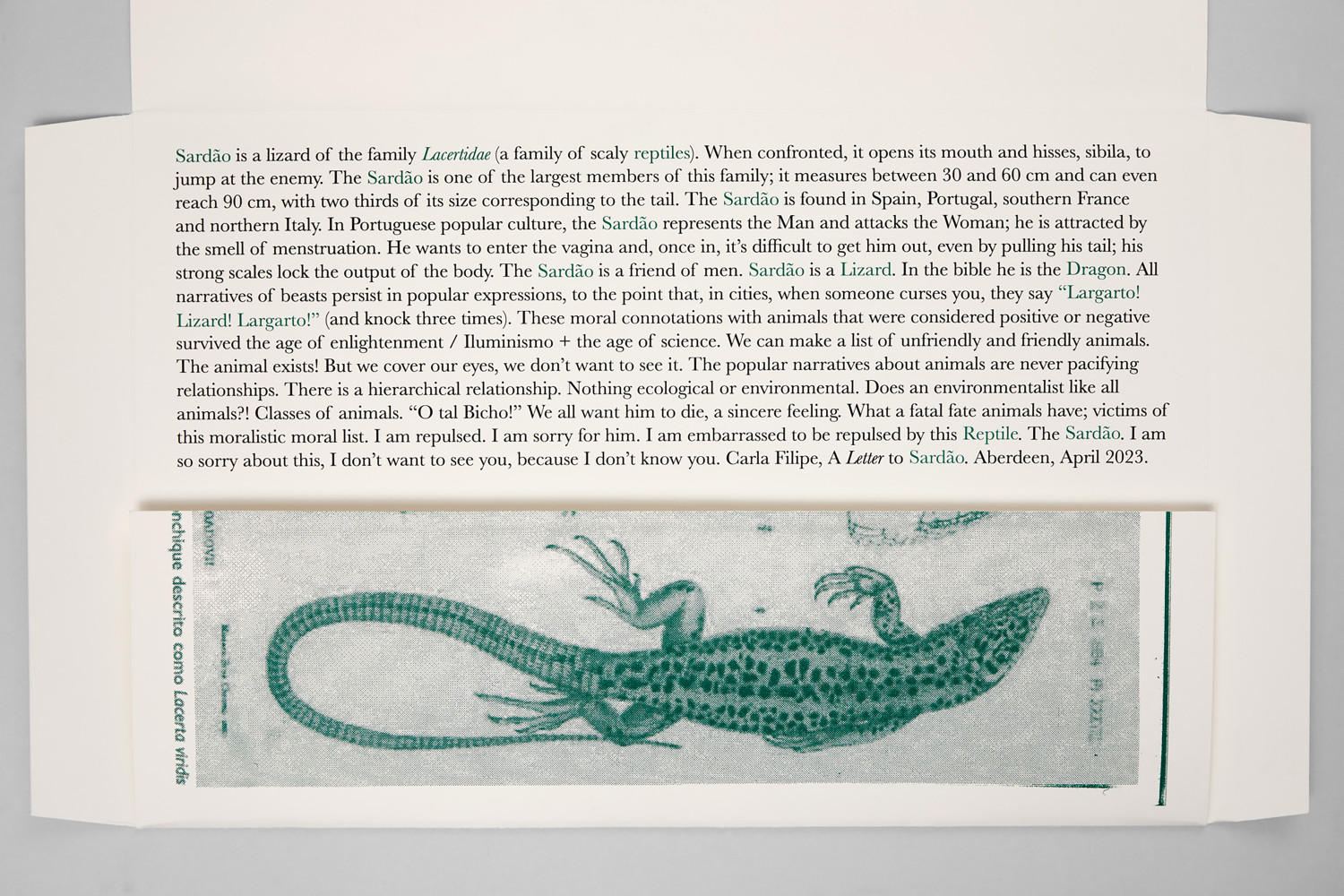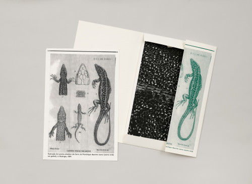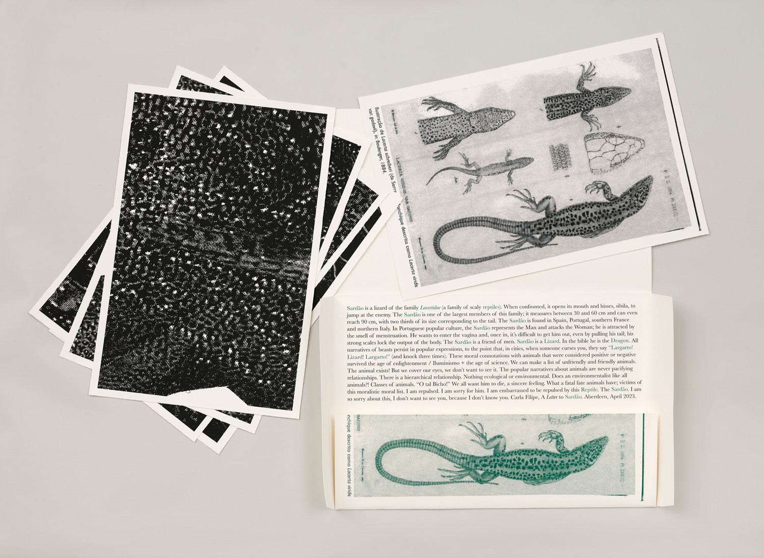 With this artist book, presented as a portfolio of prints, Portuguese artist Carla Filipe analyses a particular type of lizard, known in Portuguese as sardão, which holds her fascination as an animal steeped in folklore and popular culture. The sardão, also known as ocellated or jewelled lizard, can be found across southern Europe, and is connected to a variety of stories and legends that make it an animal feared and revered, particularly by women. In this work, the lizard is abstracted into black and white textures and patterns, and a scientific illustration: an attempt to get to know the animal more closely, perhaps, while also holding it at a safe distance.