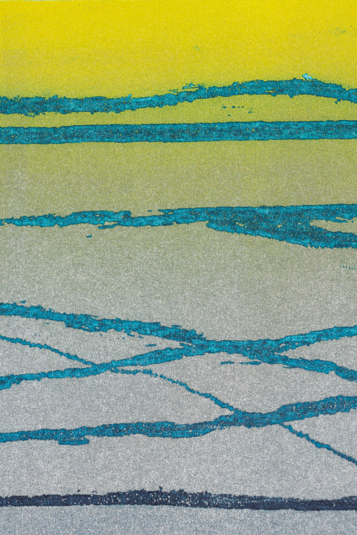 Through the varied use of bold composition, strong contrast and richly textured painted and collaged surfaces Barbara Rae evokes a memorable atmosphere in all her work. At first glance, Rae's paintings seem like planes of abstracted colour, but once your eyes adjust you can make out rural landscapes and industrial architecture. Harbours and coastlines are prominent in her paintings, where rocks become ships, and trees become electricity pylons.