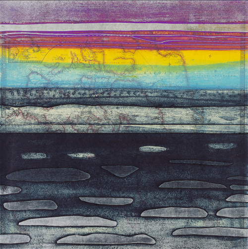 In the order of printing: 1st the blank metal plate to take the Chine-Collé map image. 2nd the relief yellow on the etching plate. 3rd the colours on the Collagraph plate. Firm pressure for the 2 etching plates then light pressure for the Collagraph plate. The glue for the Chine-Collé was a Japanese wheat starch.