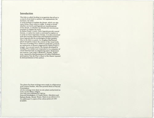 Also in the folio is a poem by Aonghas MacNeacail, which should be read in the context of the visual work. The text of Seeking Wise Salmon is itself also a search: an exploration of themes suggested by Simon Fraser's images. In a second search, the themes developed in Seeking Wise Salmon are responded to in a sequence of visual material with accompanying poetry drawn from two sources: Carl Jung's Memories, Dreams, Reflections (quoted by kind permission of Collins Publishers) and Laurens Van der Post's Heart of the Hunter (quoted by kind permission of the author).