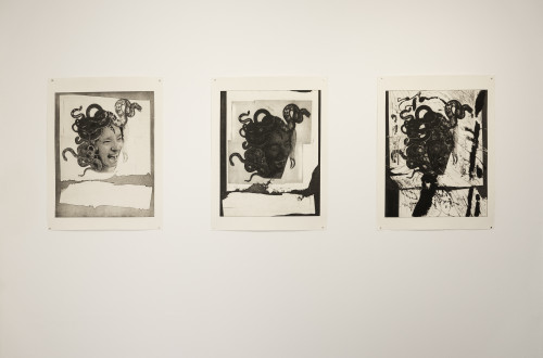 The story of Medusa, particularly her immobile head, her scream frozen by her own stare, ripples throughout art history. Le Bas’ Medusa nods to Caravaggio’s reincarnation, in his sixteenth-century painting on a convex wooden shield. Caravaggio’s Medusa is actually the artist’s self-portrait; similarly, Le Bas finds in Medusa a double and a host for her own scream. Medusa’s agony is a cry of terror and bewilderment, of facing death in yourself. There is something, however, in the depiction of a scream, that makes its silence suddenly and undeniably manifest. A muted scream is a cry that can’t be heard—an abyss of loneliness in the muted throat. Le Bas incarnates Medusa, fixing their twined screams on the surface of an etching plate, which brings the technique close to its origins in armoury decoration. In approaching the myth, Le Bas is interested in Medusa’s loneliness, cursed for a wrong in which she was the victim and not the perpetrator. That scream is the outcry of a wronged woman, all her rage.