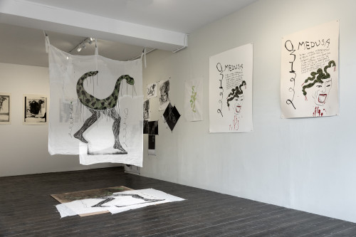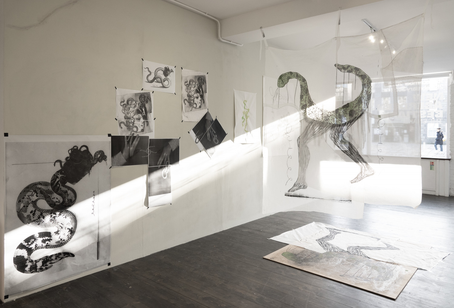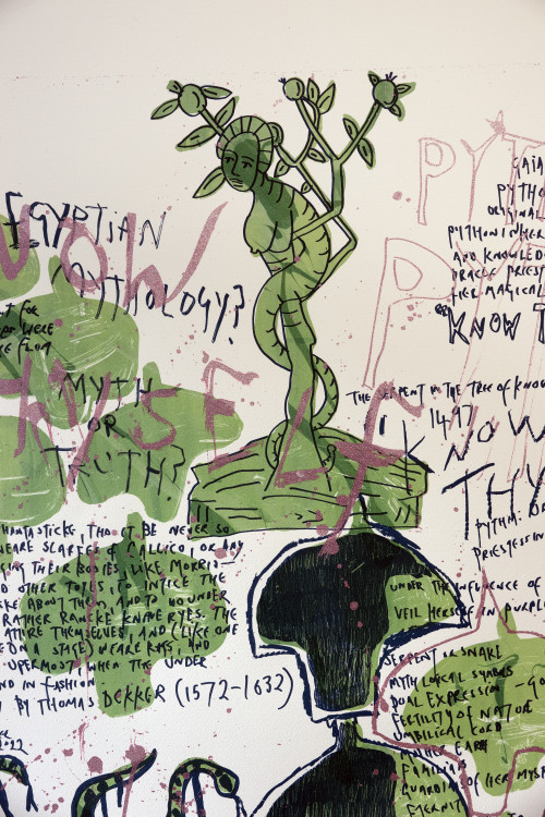 At once the centre of the exhibition and every one of its radiating nerve endings, the snake rapidly dissolves in different directions, rippling through the works under changing guises. More often than not, the reptile meets the human, in chimeric half-snake half-woman forms, a creature halfway between this world and an otherworldly, subterrain dimension. In this hybrid form, challenging and subverting its canonical representation in Christian iconography, the snake appears coiled around the tree of wisdom, its guardian and protector. This is echoed in the Greek myth of Python, a giant snake—which some sources describe as half-woman half-snake—that used to guard the Delphi oracle, one of the most important oracles and sacred places in the ancient world.