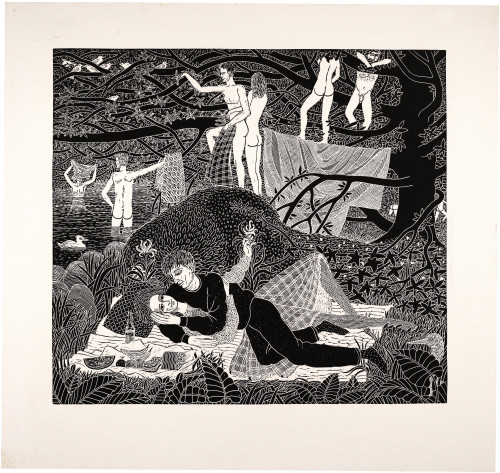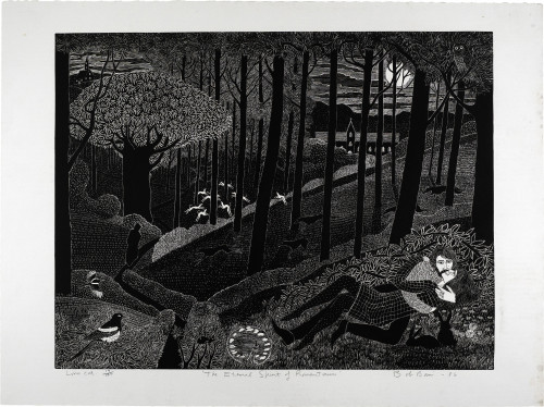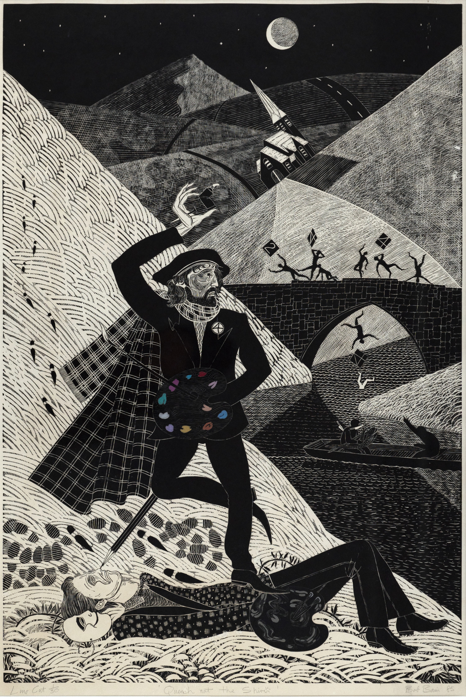 The print which was to define Bob Bain’s mature style was his linocut Spirits of the Wood where enormous fish swim through the treetops and the only human presence is the eyes peering through the undergrowth. The cutting is assured, the printing precise and the image arresting. It was first exhibited in the Royal Scottish Academy summer exhibition. There was an undoubted nod to surrealism, perhaps Rene Magritte, and this would continue through later works.