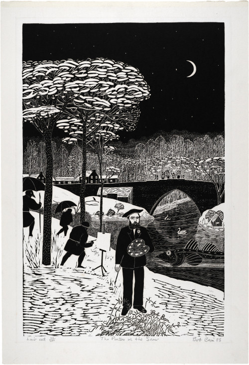 For me the defining image by Bob Bain was his Punters in the Snow where he adopts as his alter ego the french artist ‘Le Douanier’ Rousseau. He sees Rousseau as a fellow outsider as an artist, but also unworldly as he seems to float above the ground, casting no shadow. The fish from Spirits of the Wood swims up the river Don towards the Brig o Balgownie where the selection committee of the Aberdeen Artists Society hold up their voting cards showing the ‘4’ of total rejection, shared on Rousseau’s lapel badge. The punning punters from Breughal’s Hunters in the Snow appear to be searching for the perfect viewpoint from which to paint a snowscape. Below the bridge are the legs of Icarus after his fall, again quoting from Breughal.