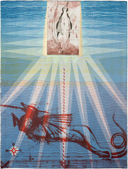Some rooms elicit curious conversations between artists working in the same medium but with completely different styles. In the room dedicated to relief prints, Tom Hammick’s reduction woodcuts from the Lunar Voyage series are an eerie, melancholic representation of interstellar travel, while Doug Cocker’s visions of outer space border on the nightmarish and the surreal. In screenprinting, Frances Walker’s meditative, personal view of an Antarctic coastal landscape sits alongside Marie Velardi’s poignant yet subtle call for attention to the risks of human intervention on shorelines.