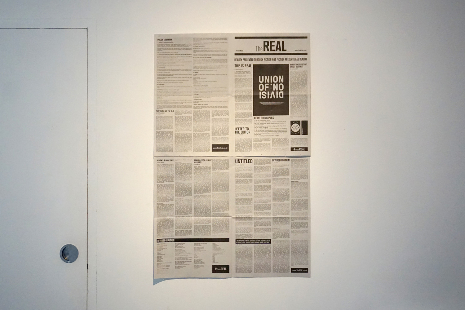 ‘Reality presented through fiction NOT fiction presented as reality’ is the manifesto proposal of ‘The Real’: a political party in inverted commas, created by artist and activist John Ayscough. Despite being a fictional entity, ‘The Real’ is a robust challenge to the British two party system and a credible, fair alternative in contrast to the slumped remains of our current democracy.