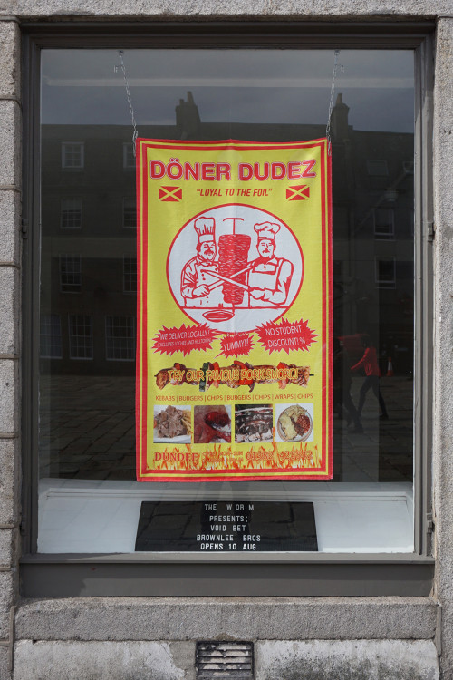 The Brownlee Brothers create work with a warped narrative combined with a tacky vulgarity and boyish humour to portray a dark caricature of growing up in Scotland. Coming from a long line of publicans, pub culture and storytelling is integral to their practice. They are interested in how stories can warp over time bringing new meaning and relevance. They bring new sanctity to the mundane by combining the paradoxical fusing influences from prison tattoos and recognizable trademarks they explore the importance of branding through the use of sigils.